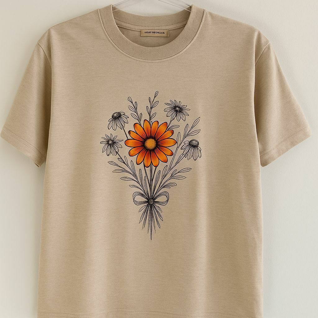 Com estampa exclusiva e toque artístico, essa t-shirt traz um buquê desenhado à mão com destaque para a flor central em tom vibrante de laranja.